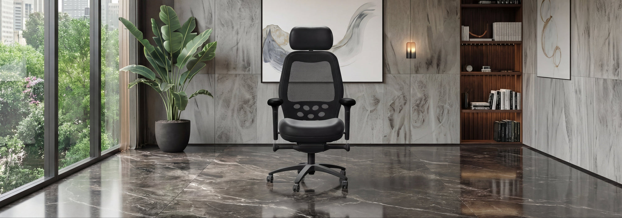 ENERSORB™ foam in seat and headrest conforms to the body when the user sits and reverts to its natural form when user exits chair.